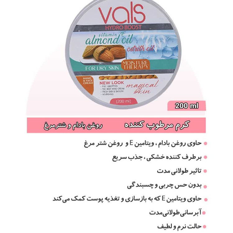 کرم مرطوب کننده دست و صورت والس حاوی روغن بادام و روغن شتر مرغ: ۵